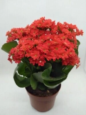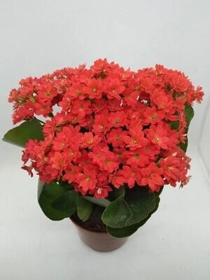 Planta Kalanchoe Blossfeldiana de flor roja con maceta.